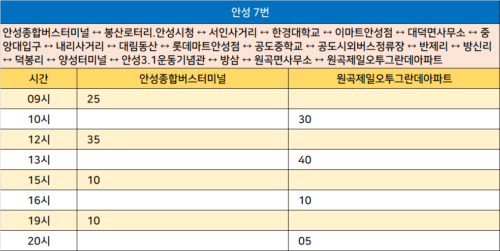 안성 7번: 안성종합버스터미널 ↔ 봉산로터리.안성시청 ↔ 서인사거리 ↔ 한경대학교 ↔ 이마트안성점 ↔ 대덕면사무소 ↔ 중앙대입구 ↔ 내리사거리 ↔ 대림동산 ↔ 롯데마트안성점 ↔ 공도중학교 ↔ 공도시외버스정류장 ↔ 반제리 ↔ 방신리 ↔ 덕봉리 ↔ 양성터미널 ↔ 안성3.1운동기념관 ↔ 방삼 ↔ 원곡면사무소 ↔ 원곡제일오투그란데아파트