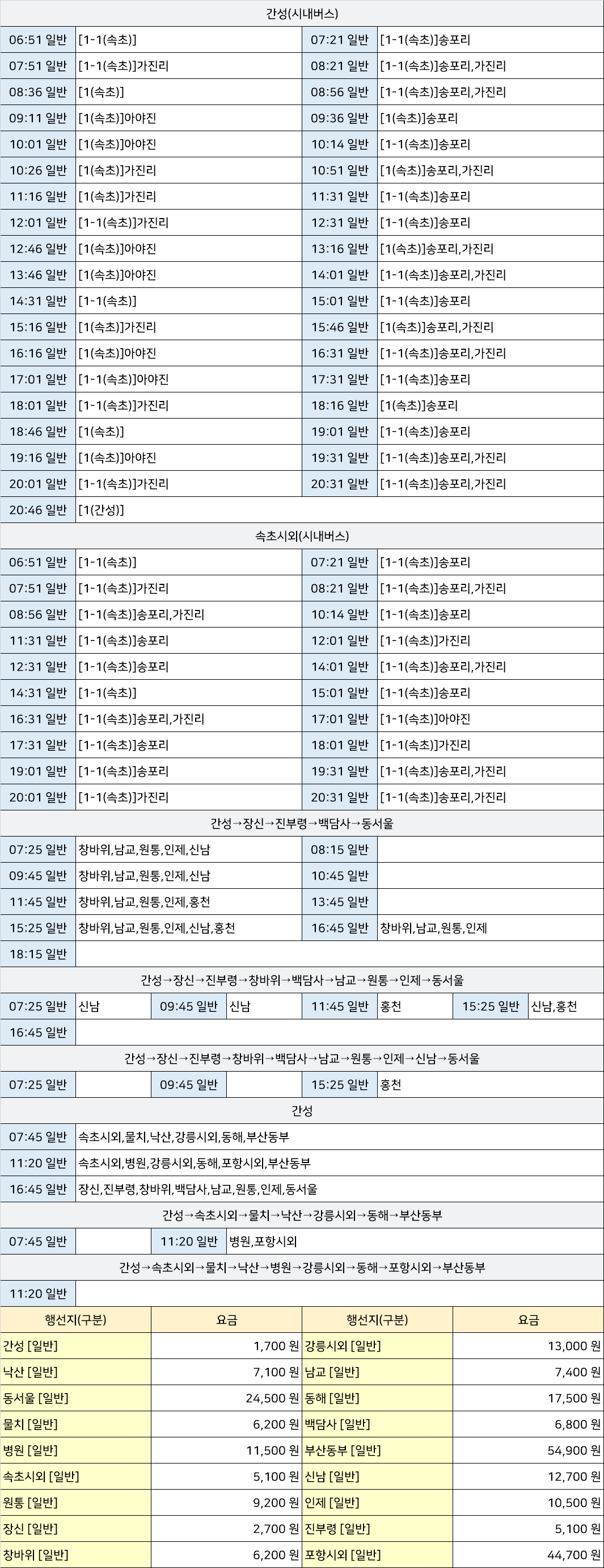 | 간성시외고속버스터미널 시간표 [간성정류소 간성정류장 간성읍터미널 신안리터미널] (0) | 2025.05.17 |