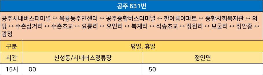 공주 631번: 공주시내버스터미널 ↔ 옥룡동주민센터 ↔ 공주종합버스터미널 ↔ 한아름아파트 ↔ 종합사회복지관 ↔ 의당 ↔ 수촌삼거리 ↔ 수촌초교 ↔ 요룡리 ↔ 오인리 ↔ 북계리 ↔ 석송초교 ↔ 장원리 ↔ 보물리 ↔ 정안중 ↔ 광정
