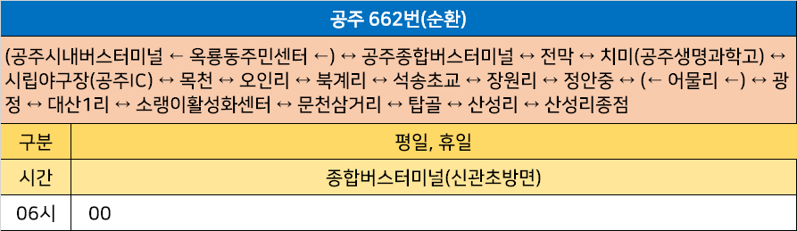 공주 662번: (공주시내버스터미널 ← 옥룡동주민센터 ←) ↔ 공주종합버스터미널 ↔ 전막 ↔ 치미(공주생명과학고) ↔ 시립야구장(공주IC) ↔ 목천 ↔ 오인리 ↔ 북계리 ↔ 석송초교 ↔ 장원리 ↔ 정안중 ↔ (← 어물리 ←) ↔ 광정 ↔ 대산1리 ↔ 소랭이활성화센터 ↔ 문천삼거리 ↔ 탑골 ↔ 산성리 ↔ 산성리종점