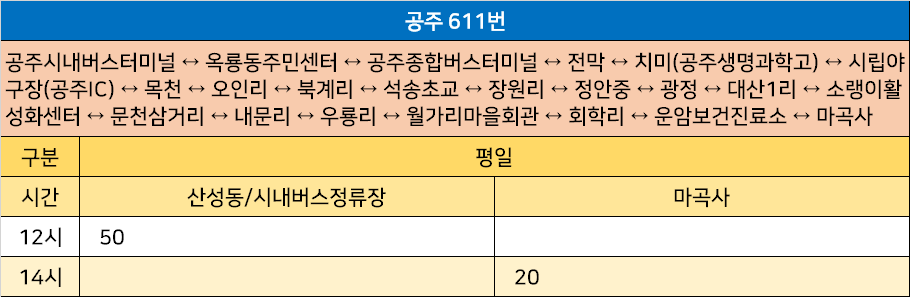 공주 611번: 공주시내버스터미널 ↔ 옥룡동주민센터 ↔ 공주종합버스터미널 ↔ 전막 ↔ 치미(공주생명과학고) ↔ 시립야구장(공주IC) ↔ 목천 ↔ 오인리 ↔ 북계리 ↔ 석송초교 ↔ 장원리 ↔ 정안중 ↔ 광정 ↔ 대산1리 ↔ 소랭이활성화센터 ↔ 문천삼거리 ↔ 내문리 ↔ 우룡리 ↔ 월가리마을회관 ↔ 회학리 ↔ 운암보건진료소 ↔ 마곡사