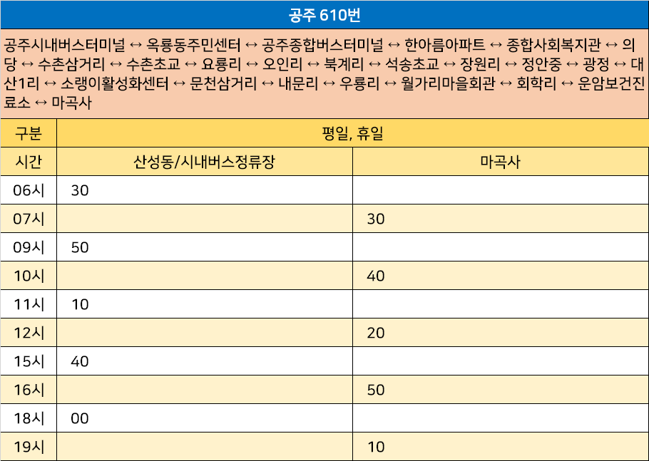 공주 610번: 공주시내버스터미널 ↔ 옥룡동주민센터 ↔ 공주종합버스터미널 ↔ 한아름아파트 ↔ 종합사회복지관 ↔ 의당 ↔ 수촌삼거리 ↔ 수촌초교 ↔ 요룡리 ↔ 오인리 ↔ 북계리 ↔ 석송초교 ↔ 장원리 ↔ 정안중 ↔ 광정 ↔ 대산1리 ↔ 소랭이활성화센터 ↔ 문천삼거리 ↔ 내문리 ↔ 우룡리 ↔ 월가리마을회관 ↔ 회학리 ↔ 운암보건진료소 ↔ 마곡사