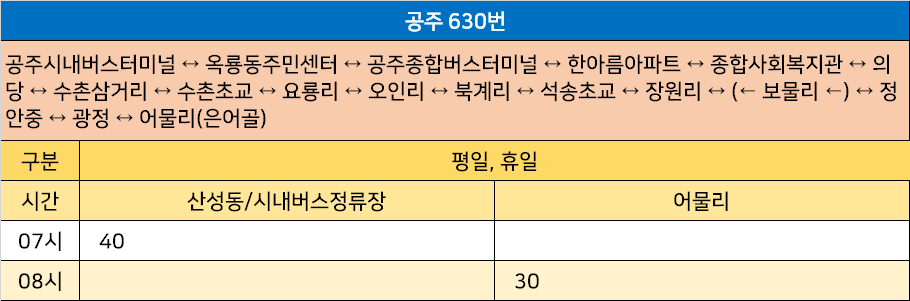 공주 630번: 공주시내버스터미널 ↔ 옥룡동주민센터 ↔ 공주종합버스터미널 ↔ 한아름아파트 ↔ 종합사회복지관 ↔ 의당 ↔ 수촌삼거리 ↔ 수촌초교 ↔ 요룡리 ↔ 오인리 ↔ 북계리 ↔ 석송초교 ↔ 장원리 ↔ (← 보물리 ←) ↔ 정안중 ↔ 광정 ↔ 어물리(은어골)
