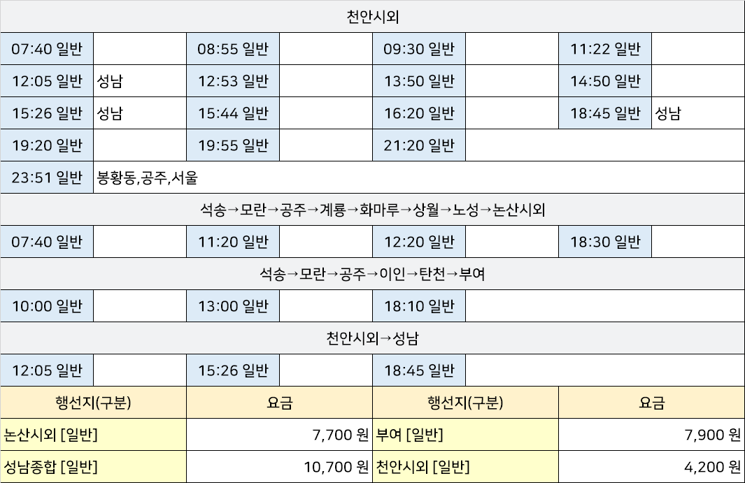 | 공주종합시외고속버스터미널 시간표 [공주정류소 공주정류장 신관동터미널] (0) | 2025.04.03 |