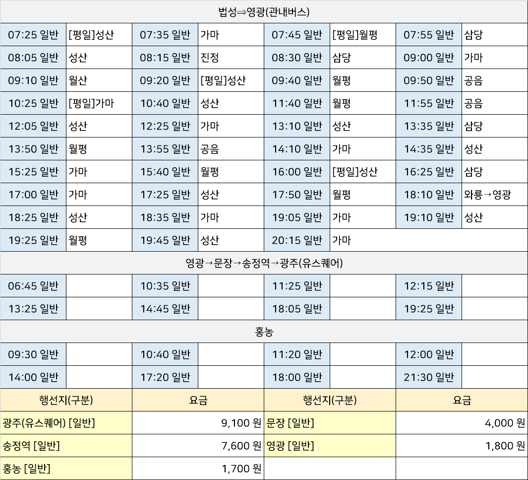 법성시외고속버스터미널 법성정류소 법성정류장 → "가마,공음,법성⇒영광(관내버스),삼당,성산,영광→문장→송정역→광주(유스퀘어),와룡,월산,월평,진정,홍농".