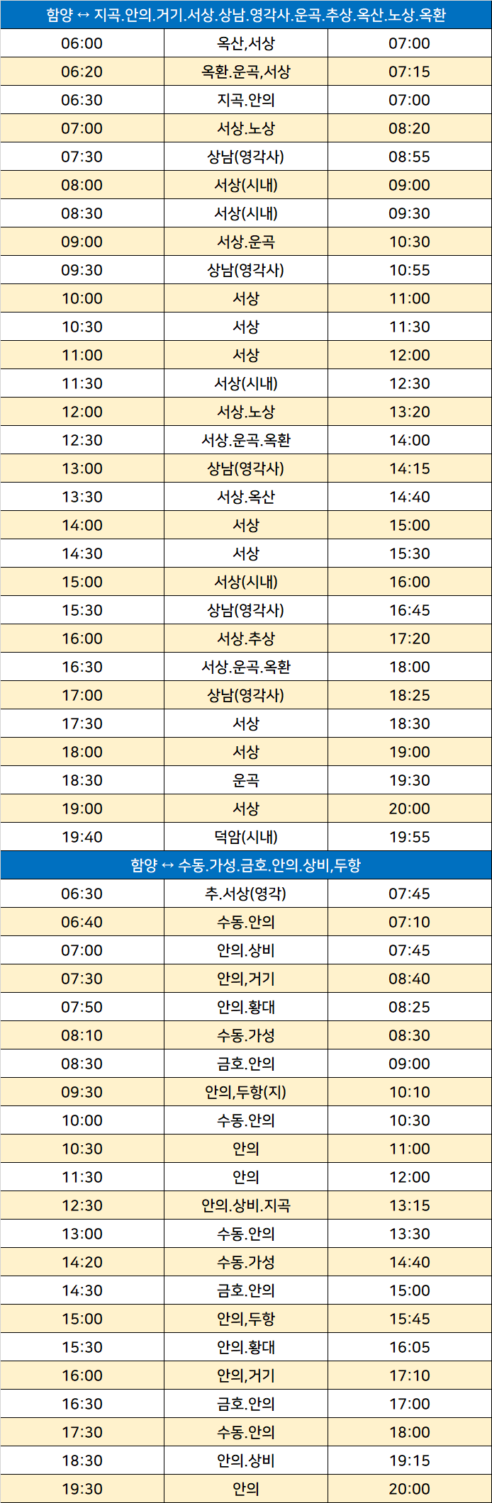 함양 안의행 노선정보: 함양 ↔ 지곡.안의.거기.서상.상남.영각사.운곡.추상.옥산.노상.옥환 , 노상, 덕암, 상남(영각사), 서상, 안의, 옥산, 옥환, 운곡, 지곡, 추상, 함양 ↔ 수동.가성.금호.안의.상비,두항, 가성, 거기, 금호, 두항, 상비, 서상(영각), 수동, 안의, 지곡, 황대