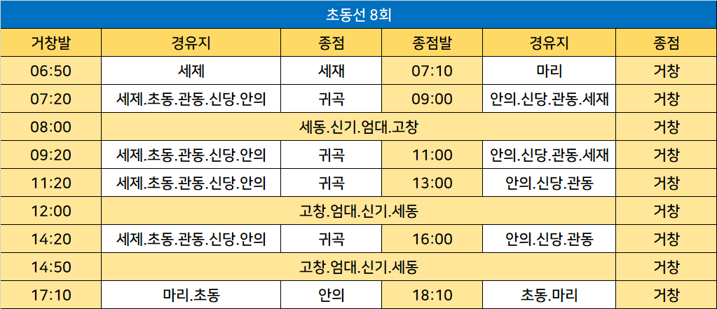 초동선 노선정보: 거창 → 세제 → 세재 → 마리 → 거창, 거창 → 세제 → 초동 → 관동 → 신당 → 안의 → 귀곡 → 안의 → 신당 → 관동 → 세재 → 거창, 거창 → 세동 → 신기 → 엄대 → 고창 → 거창, 거창 → 세제 → 초동 → 관동 → 신당 → 안의 → 귀곡 → 안의 → 신당 → 관동 → 거창, 거창 → 고창 → 엄대 → 신기 → 세동 → 거창