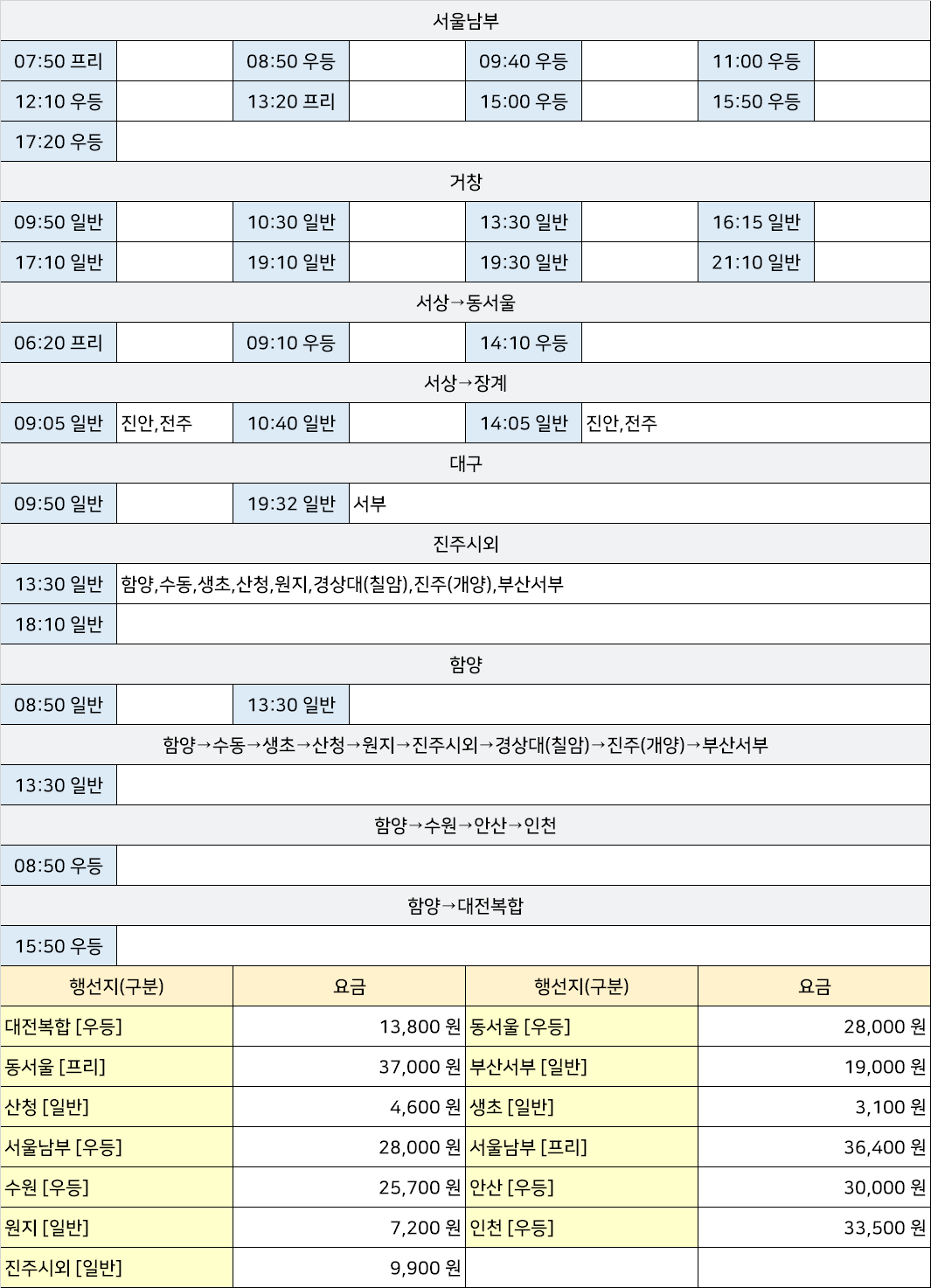 안의시외고속버스터미널 안의정류장 안의정류소 → "거창,대구,서상→동서울,서상→장계,서울남부,전주,진안,함양→대전,함양→수동→생초→산청→원지→진주시외→경상대(칠암)→진주(개양)→부산서부,함양→수원→안산→인천".