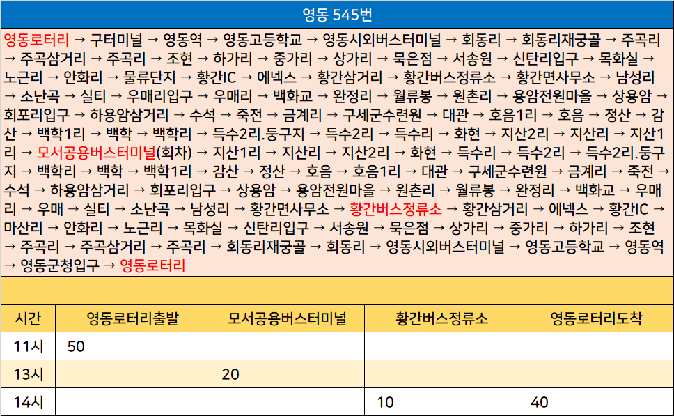 영동 545번: 영동로터리 → 구터미널 → 영동역 → 영동고등학교 → 영동시외버스터미널 → 회동리 → 회동리재궁골 → 주곡리 → 주곡삼거리 → 주곡리 → 조현 → 하가리 → 중가리 → 상가리 → 묵은점 → 서송원 → 신탄리입구 → 목화실 → 노근리 → 안화리 → 물류단지 → 황간IC → 에넥스 → 황간삼거리 → 황간버스정류소 → 황간면사무소 → 남성리 → 소난곡 → 실티 → 우매리입구 → 우매리 → 백화교 → 완정리 → 월류봉 → 원촌리 → 용암전원마을 → 상용암 → 회포리입구 → 하용암삼거리 → 수석 → 죽전 → 금계리 → 구세군수련원 → 대관 → 호음1리 → 호음 → 정산 → 감산 → 백학1리 → 백학 → 백학리 → 득수2리.둥구지 → 득수2리 → 득수리 → 화현 → 지산2리 → 지산리 → 지산1리 → 모서공용버스터미널(회차) → 지산1리 → 지산리 → 지산2리 → 화현 → 득수리 → 득수2리 → 득수2리.둥구지 → 백학리 → 백학 → 백학1리 → 감산 → 정산 → 호음 → 호음1리 → 대관 → 구세군수련원 → 금계리 → 죽전 → 수석 → 하용암삼거리 → 회포리입구 → 상용암 → 용암전원마을 → 원촌리 → 월류봉 → 완정리 → 백화교 → 우매리 → 우매 → 실티 → 소난곡 → 남성리 → 황간면사무소 → 황간버스정류소 → 황간삼거리 → 에넥스 → 황간IC → 마산리 → 안화리 → 노근리 → 목화실 → 신탄리입구 → 서송원 → 묵은점 → 상가리 → 중가리 → 하가리 → 조현 → 주곡리 → 주곡삼거리 → 주곡리 → 회동리재궁골 → 회동리 → 영동시외버스터미널 → 영동고등학교 → 영동역 → 영동군청입구 → 영동로터리