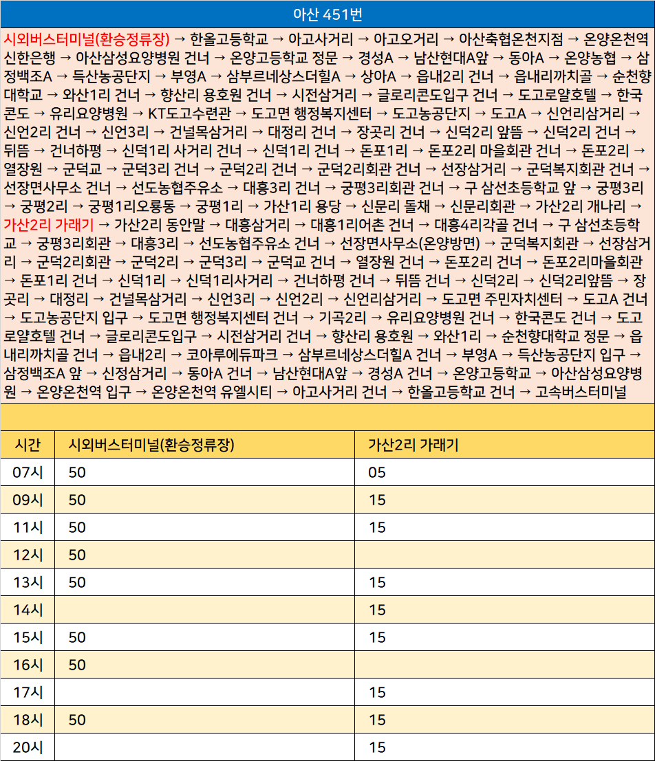 아산 451번: 시외버스터미널(환승정류장) → 한올고등학교 → 아고사거리 → 아고오거리 → 아산축협온천지점 → 온양온천역 신한은행 → 아산삼성요양병원 건너 → 온양고등학교 정문 → 경성A → 남산현대A앞 → 동아A → 온양농협 → 삼정백조A → 득산농공단지 → 부영A → 삼부르네상스더힐A → 상아A → 읍내2리 건너 → 읍내리까치골 → 순천향대학교 → 와산1리 건너 → 향산리 용호원 건너 → 시전삼거리 → 글로리콘도입구 건너 → 도고로얄호텔 → 한국콘도 → 유리요양병원 → KT도고수련관 → 도고면 행정복지센터 → 도고농공단지 → 도고A → 신언리삼거리 → 신언2리 건너 → 신언3리 → 건널목삼거리 → 대정리 건너 → 장곳리 건너 → 신덕2리 앞뜸 → 신덕2리 건너 → 뒤뜸 → 건너하평 → 신덕1리 사거리 건너 → 신덕1리 건너 → 돈포1리 → 돈포2리 마을회관 건너 → 돈포2리 → 열장원 → 군덕교 → 군덕3리 건너 → 군덕2리 건너 → 군덕2리회관 건너 → 선장삼거리 → 군덕복지회관 건너 → 선장면사무소 건너 → 선도농협주유소 → 대흥3리 건너 → 궁평3리회관 건너 → 구 삼선초등학교 앞 → 궁평3리 → 궁평2리 → 궁평1리오룡동 → 궁평1리 → 가산1리 용당 → 신문리 돌채 → 신문리회관 → 가산2리 개나리 → 가산2리 가래기 → 가산2리 동안말 → 대흥삼거리 → 대흥1리어촌 건너 → 대흥4리각골 건너 → 구 삼선초등학교 → 궁평3리회관 → 대흥3리 → 선도농협주유소 건너 → 선장면사무소(온양방면) → 군덕복지회관 → 선장삼거리 → 군덕2리회관 → 군덕2리 → 군덕3리 → 군덕교 건너 → 열장원 건너 → 돈포2리 건너 → 돈포2리마을회관 → 돈포1리 건너 → 신덕1리 → 신덕1리사거리 → 건너하평 건너 → 뒤뜸 건너 → 신덕2리 → 신덕2리앞뜸 → 장곳리 → 대정리 → 건널목삼거리 → 신언3리 → 신언2리 → 신언리삼거리 → 도고면 주민자치센터 → 도고A 건너 → 도고농공단지 입구 → 도고면 행정복지센터 건너 → 기곡2리 → 유리요양병원 건너 → 한국콘도 건너 → 도고로얄호텔 건너 → 글로리콘도입구 → 시전삼거리 건너 → 향산리 용호원 → 와산1리 → 순천향대학교 정문 → 읍내리까치골 건너 → 읍내2리 → 코아루에듀파크 → 삼부르네상스더힐A 건너 → 부영A → 득산농공단지 입구 → 삼정백조A 앞 → 신정삼거리 → 동아A 건너 → 남산현대A앞 → 경성A 건너 → 온양고등학교 → 아산삼성요양병원 → 온양온천역 입구 → 온양온천역 유엘시티 → 아고사거리 건너 → 한올고등학교 건너 → 고속버스터미널