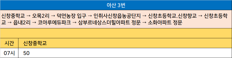 아산 3번: 신창중학교 → 오목2리 → 덕연농장 입구 → 인취사신창읍농공단지 → 신창초등학교.신창향교 → 신창초등학교 → 읍내2리 → 코아루에듀파크 → 삼부르네상스더힐아파트 정문 → 소화아파트 정문