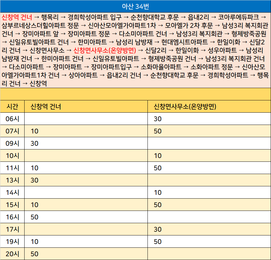 아산 34번: 신창역 건너 → 행목리 → 경희학성아파트 입구 → 순천향대학교 후문 → 읍내2리 → 코아루에듀파크 → 삼부르네상스더힐아파트 정문 → 신아산모아엘가아파트1차 → 모아엘가 2차 후문 → 남성3리 복지회관 건너 → 장미아파트 앞 → 장미아파트 정문 → 다소미아파트 건너 → 남성3리 복지회관 → 형제방죽공원 → 신일유토빌아파트 건너 → 한미아파트 → 남성리 남방재 → 현대엠시트아파트 → 한일이화 → 신달2리 건너 → 신창면사무소 → 신창면사무소(온양방면) → 신달2리 → 한일이화 → 성우아파트 → 남성리 남방재 건너 → 한미아파트 건너 → 신일유토빌아파트 → 형제방죽공원 건너 → 남성3리 복지회관 건너 → 다소미아파트 → 장미아파트 → 장미아파트입구 → 소화마을아파트 → 소화아파트 정문 → 신아산모아엘가아파트1차 건너 → 상아아파트 → 읍내2리 건너 → 순천향대학교 후문 → 경희학성아파트 → 행목리 건너 → 신창역