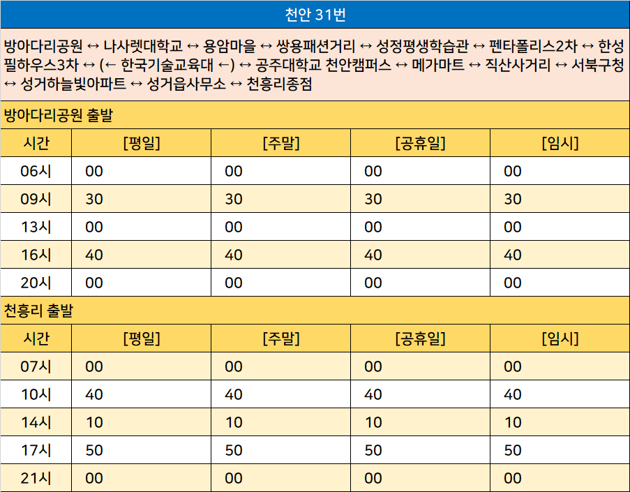 천안 31번: 방아다리공원 ↔ 나사렛대학교 ↔ 용암마을 ↔ 쌍용패션거리 ↔ 성정평생학습관 ↔ 펜타폴리스2차 ↔ 한성필하우스3차 ↔ (← 한국기술교육대 ←) ↔ 공주대학교 천안캠퍼스 ↔ 메가마트 ↔ 직산사거리 ↔ 서북구청 ↔ 성거하늘빛아파트 ↔ 성거읍사무소 ↔ 천흥리종점