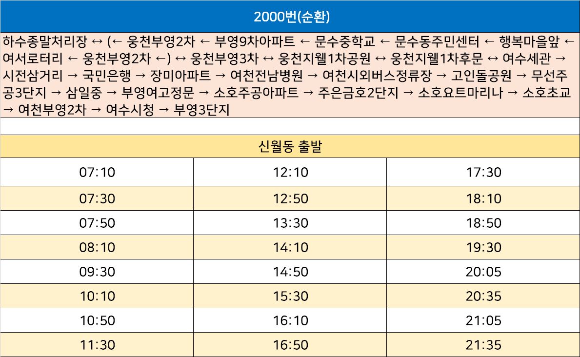 여수 2000번(순환): 하수종말처리장 ↔ (← 웅천부영2차 ← 부영9차아파트 ← 문수중학교 ← 문수동주민센터 ← 행복마을앞 ← 여서로터리 ← 웅천부영2차 ←) ↔ 웅천부영3차 ↔ 웅천지웰1차공원 ↔ 웅천지웰1차후문 ↔ 여수세관 → 시전삼거리 → 국민은행 → 장미아파트 → 여천전남병원 → 여천시외버스정류장 → 고인돌공원 → 무선주공3단지 → 삼일중 → 부영여고정문 → 소호주공아파트 → 주은금호2단지 → 소호요트마리나 → 소호초교 → 여천부영2차 → 여수시청 → 부영3단지