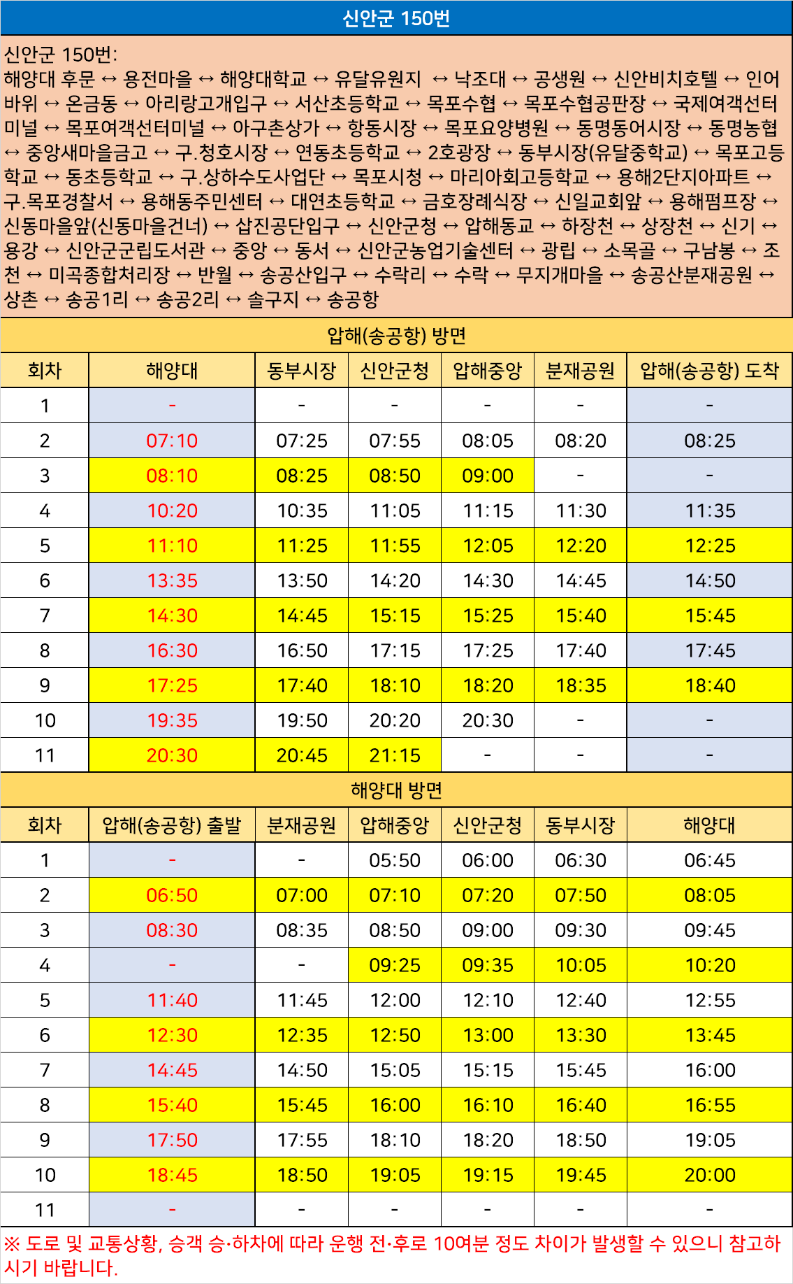 신안군 150번: 해양대 후문 ↔ 용전마을 ↔ 해양대학교 ↔ 유달유원지 ↔ 낙조대 ↔ 공생원 ↔ 신안비치호텔 ↔ 인어바위 ↔ 온금동 ↔ 아리랑고개입구 ↔ 서산초등학교 ↔ 목포수협 ↔ 목포수협공판장 ↔ 국제여객선터미널 ↔ 목포여객선터미널 ↔ 아구촌상가 ↔ 항동시장 ↔ 목포요양병원 ↔ 동명동어시장 ↔ 동명농협 ↔ 중앙새마을금고 ↔ 구.청호시장 ↔ 연동초등학교 ↔ 2호광장 ↔ 동부시장(유달중학교) ↔ 목포고등학교 ↔ 동초등학교 ↔ 구.상하수도사업단 ↔ 목포시청 ↔ 마리아회고등학교 ↔ 용해2단지아파트 ↔ 구.목포경찰서 ↔ 용해동주민센터 ↔ 대연초등학교 ↔ 금호장례식장 ↔ 신일교회앞 ↔ 용해펌프장 ↔ 신동마을앞(신동마을건너) ↔ 삽진공단입구 ↔ 신안군청 ↔ 압해동교 ↔ 하장천 ↔ 상장천 ↔ 신기 ↔ 용강 ↔ 신안군군립도서관 ↔ 중앙 ↔ 동서 ↔ 신안군농업기술센터 ↔ 광립 ↔ 소목골 ↔ 구남봉 ↔ 조천 ↔ 미곡종합처리장 ↔ 반월 ↔ 송공산입구 ↔ 수락리 ↔ 수락 ↔ 무지개마을 ↔ 송공산분재공원 ↔ 상촌 ↔ 송공1리 ↔ 송공2리 ↔ 솔구지 ↔ 송공항