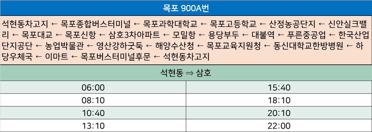 목포 900A번: 석현동차고지 ← 목포종합버스터미널 ← 목포과학대학교 ← 목포고등학교 ← 산정농공단지 ← 신안실크밸리 ← 목포대교 ← 목포신항 ← 삼호3차아파트 ← 모밀항 ← 용당부두 ← 대불역 ← 푸른중공업 ← 한국산업단지공단 ← 농업박물관 ← 영산강하굿둑 ← 해양수산청 ← 목포교육지원청 ← 동신대학교한방병원 ← 하당우체국 ← 이마트 ← 목포버스터미널후문 ← 석현동차고지