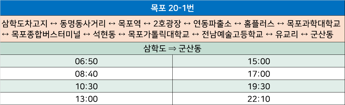 목포 20-1번: 삼학도차고지 ↔ 동명동사거리 ↔ 목포역 ↔ 2호광장 ↔ 연동파출소 ↔ 홈플러스 ↔ 목포과학대학교 ↔ 목포종합버스터미널 ↔ 석현동 ↔ 목포가톨릭대학교 ↔ 전남예술고등학교 ↔ 유교리 ↔ 군산동