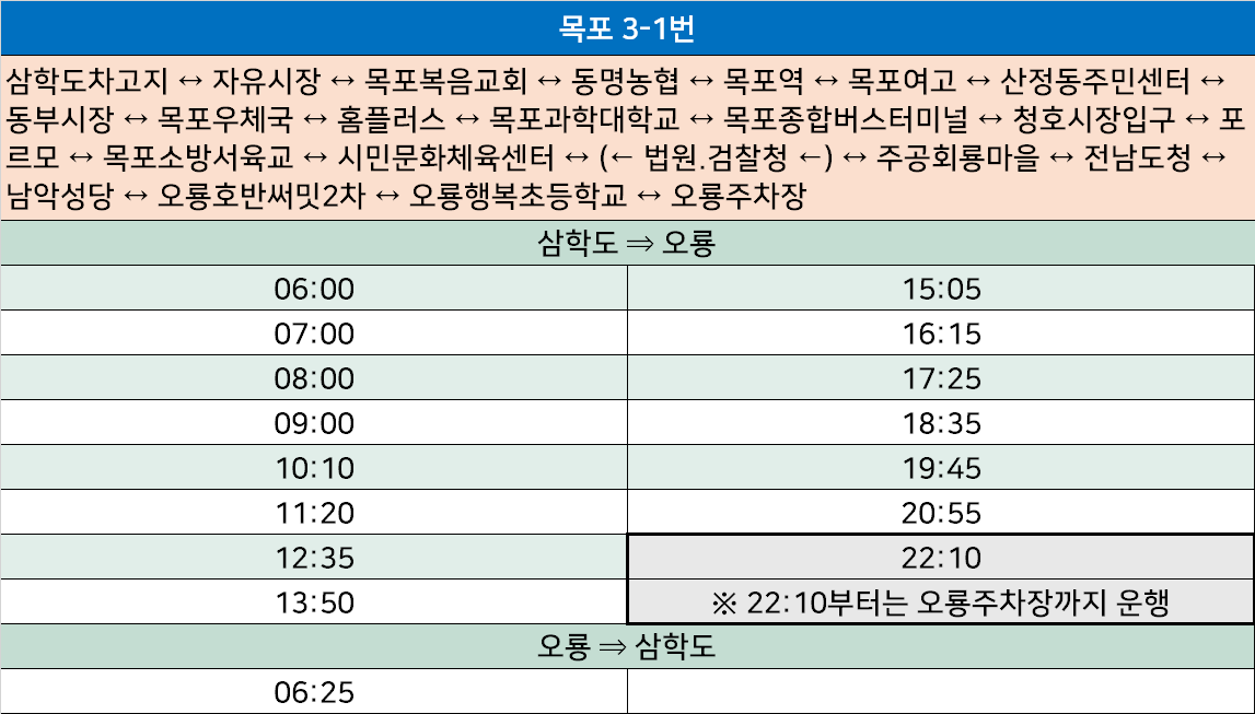 목포 3-1번: 삼학도차고지 ↔ 자유시장 ↔ 목포복음교회 ↔ 동명농협 ↔ 목포역 ↔ 목포여고 ↔ 산정동주민센터 ↔ 동부시장 ↔ 목포우체국 ↔ 홈플러스 ↔ 목포과학대학교 ↔ 목포종합버스터미널 ↔ 청호시장입구 ↔ 포르모 ↔ 목포소방서육교 ↔ 시민문화체육센터 ↔ (← 법원.검찰청 ←) ↔ 주공회룡마을 ↔ 전남도청 ↔ 남악성당 ↔ 오룡호반써밋2차 ↔ 오룡행복초등학교 ↔ 오룡주차장