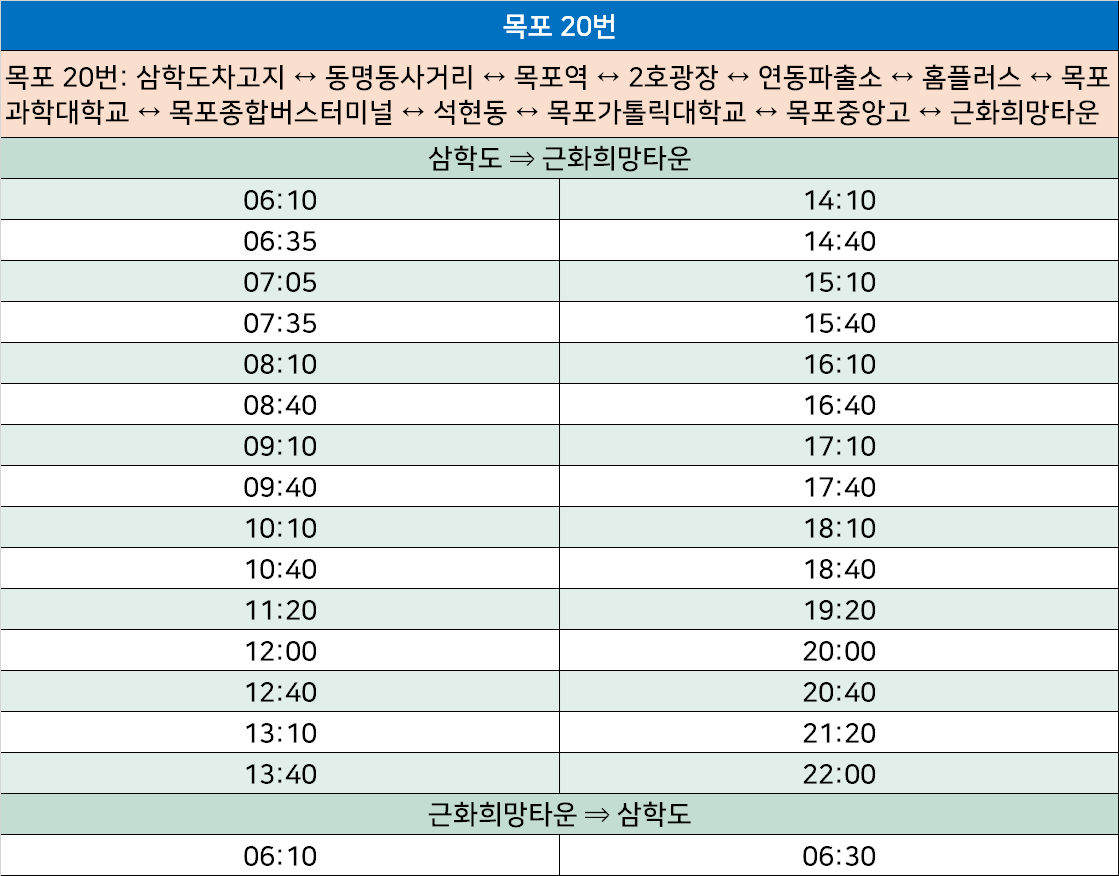 목포 20번: 삼학도차고지 ↔ 동명동사거리 ↔ 목포역 ↔ 2호광장 ↔ 연동파출소 ↔ 홈플러스 ↔ 목포과학대학교 ↔ 목포종합버스터미널 ↔ 석현동 ↔ 목포가톨릭대학교 ↔ 목포중앙고 ↔ 근화희망타운