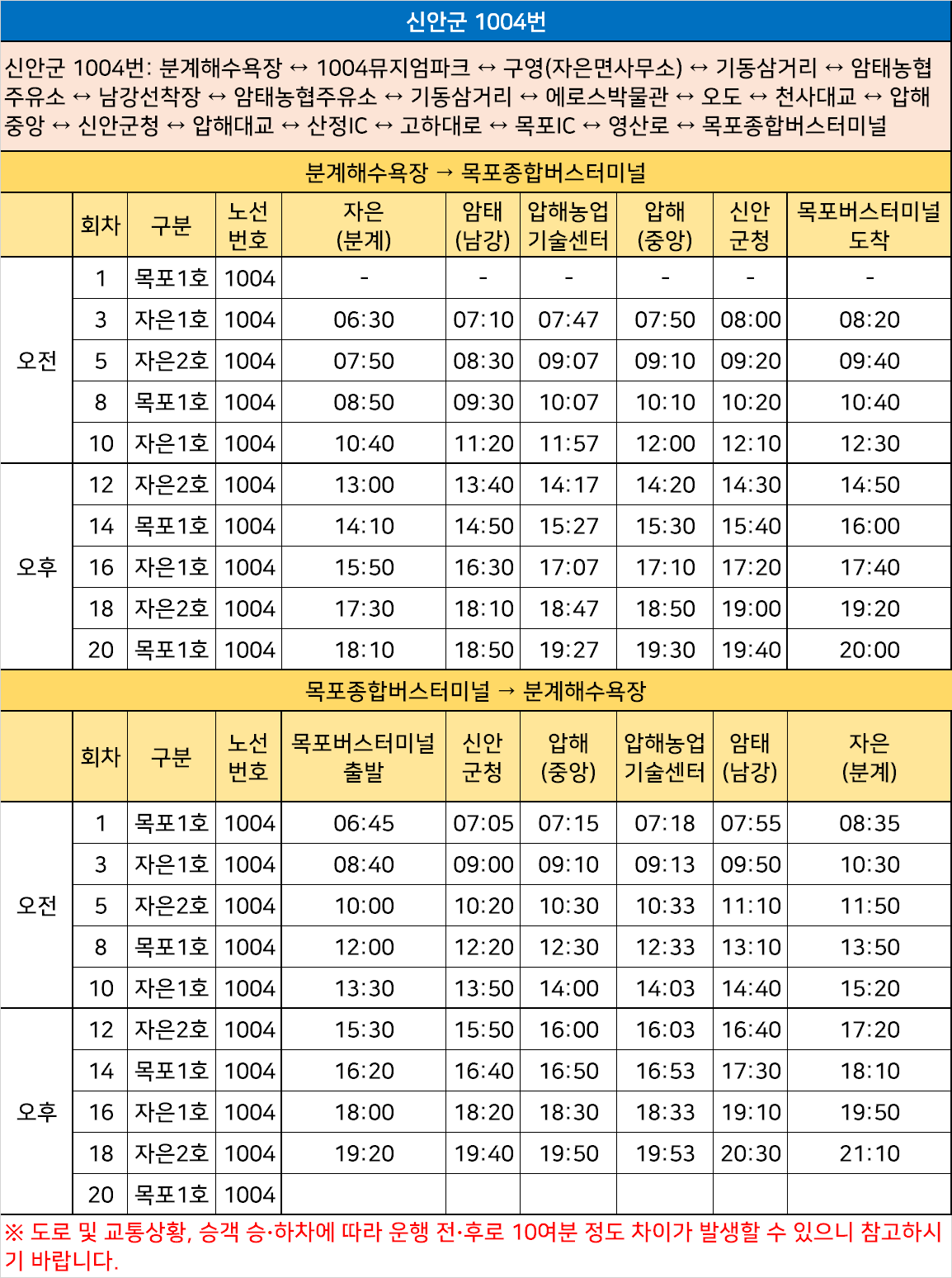 신안군 1004번: 분계해수욕장 ↔ 1004뮤지엄파크 ↔ 구영(자은면사무소) ↔ 기동삼거리 ↔ 암태농협주유소 ↔ 남강선착장 ↔ 암태농협주유소 ↔ 기동삼거리 ↔ 에로스박물관 ↔ 오도 ↔ 천사대교 ↔ 압해중앙 ↔ 신안군청 ↔ 압해대교 ↔ 산정IC ↔ 고하대로 ↔ 목포IC ↔ 영산로 ↔ 목포종합버스터미널