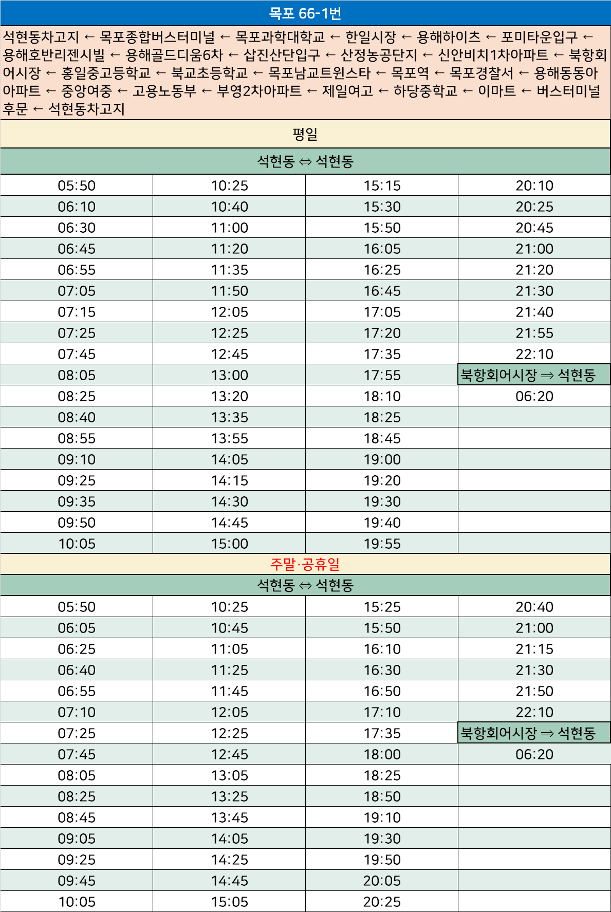 목포 66-1번: 석현동차고지 ← 목포종합버스터미널 ← 목포과학대학교 ← 한일시장 ← 용해하이츠 ← 포미타운입구 ← 용해호반리젠시빌 ← 용해골드디움6차 ← 삽진산단입구 ← 산정농공단지 ← 신안비치1차아파트 ← 북항회어시장 ← 홍일중고등학교 ← 북교초등학교 ← 목포남교트윈스타 ← 목포역 ← 목포경찰서 ← 용해동동아아파트 ← 중앙여중 ← 고용노동부 ← 부영2차아파트 ← 제일여고 ← 하당중학교 ← 이마트 ← 버스터미널후문 ← 석현동차고지