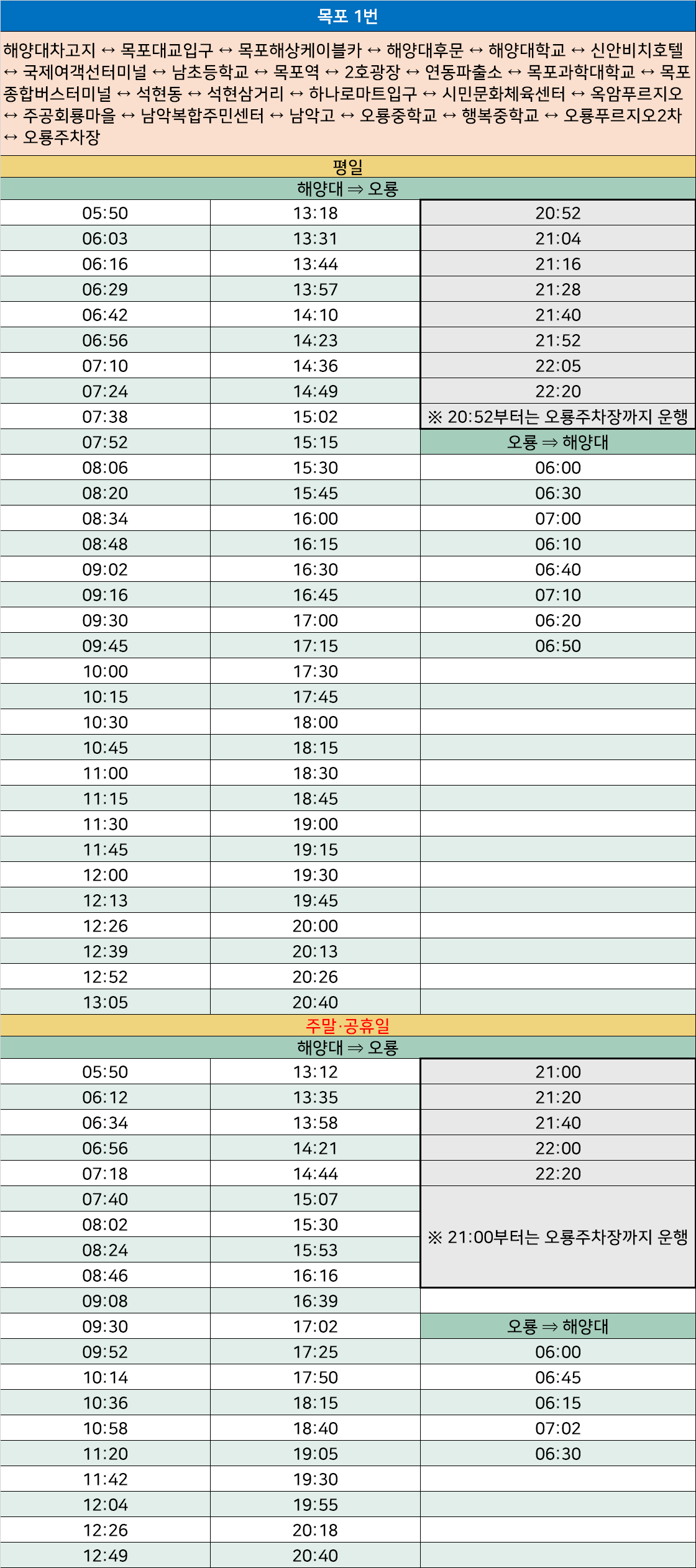 목포 1번: 해양대차고지 ↔ 목포대교입구 ↔ 목포해상케이블카 ↔ 해양대후문 ↔ 해양대학교 ↔ 신안비치호텔 ↔ 국제여객선터미널 ↔ 남초등학교 ↔ 목포역 ↔ 2호광장 ↔ 연동파출소 ↔ 목포과학대학교 ↔ 목포종합버스터미널 ↔ 석현동 ↔ 석현삼거리 ↔ 하나로마트입구 ↔ 시민문화체육센터 ↔ 옥암푸르지오 ↔ 주공회룡마을 ↔ 남악복합주민센터 ↔ 남악고 ↔ 오룡중학교 ↔ 행복중학교 ↔ 오룡푸르지오2차 ↔ 오룡주차장