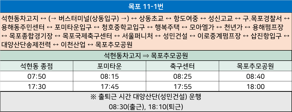 목포 11-1번: 석현동차고지 ↔ (→ 버스터미널(상동입구) →) ↔ 상동초교 ↔ 항도여중 ↔ 성신고교 ↔ 구.목포경찰서 ↔ 용해동주민센터 ↔ 포미타운입구 ↔ 청호중학교입구 ↔ 행복주택 ↔ 모아엘가 ↔ 천년가 ↔ 용해펌프장 ↔ 목포종합경기장 ↔ 목포국제축구센터 ↔ 서울퍼니처 ↔ 성민건설 ↔ 이로중계펌프장 ↔ 삽진항입구 ↔ 대양산단송제전력 ↔ 이천산업 ↔ 목포추모공원