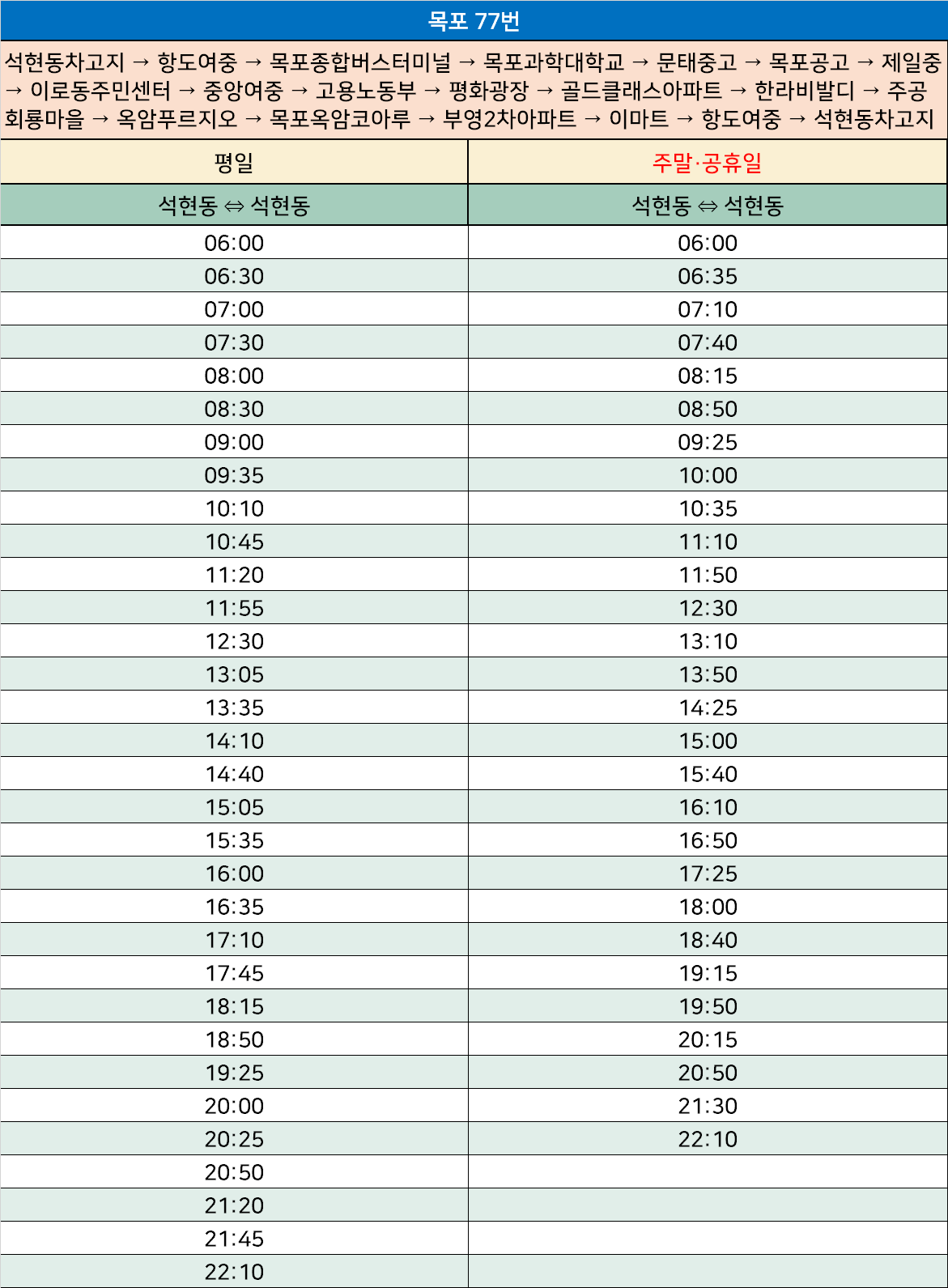 목포 77번: 석현동차고지 → 항도여중 → 목포종합버스터미널 → 목포과학대학교 → 문태중고 → 목포공고 → 제일중 → 이로동주민센터 → 중앙여중 → 고용노동부 → 평화광장 → 골드클래스아파트 → 한라비발디 → 주공회룡마을 → 옥암푸르지오 → 목포옥암코아루 → 부영2차아파트 → 이마트 → 항도여중 → 석현동차고지