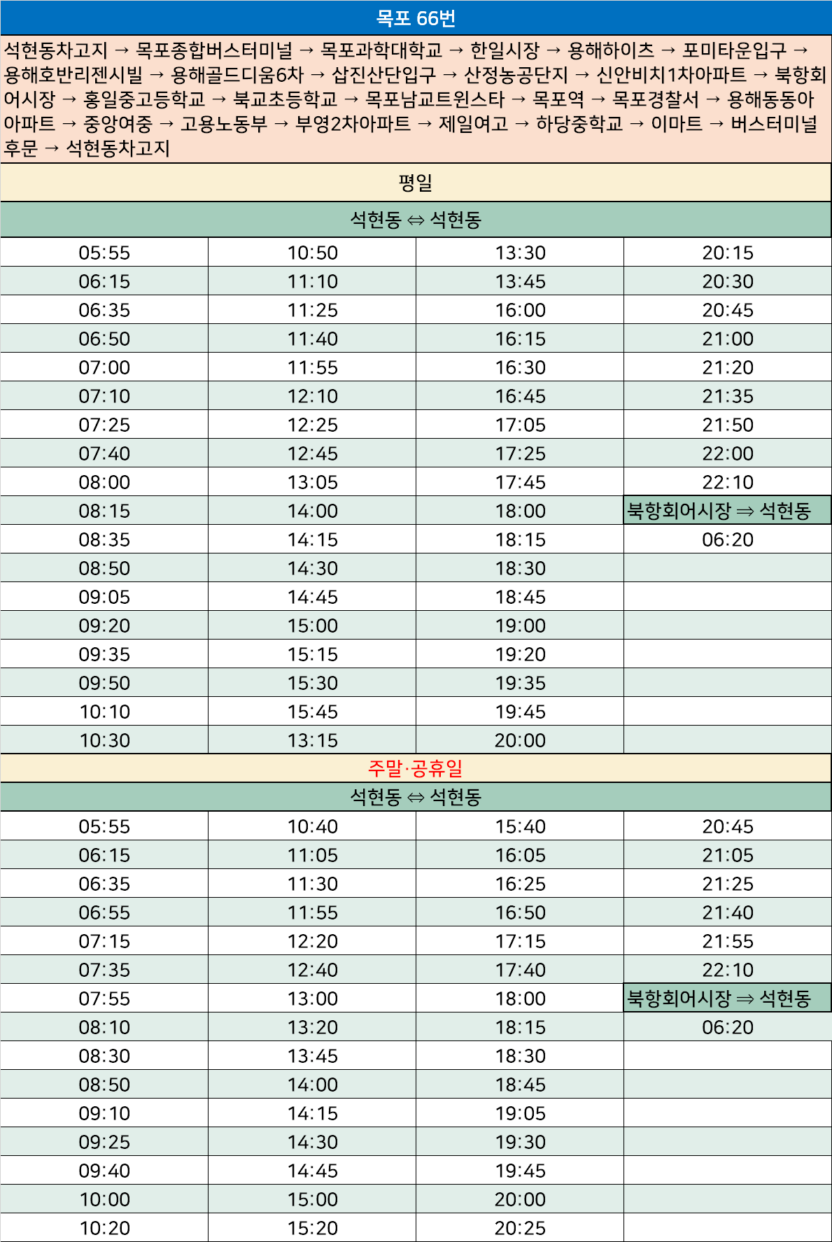 목포 66번: 석현동차고지 → 목포종합버스터미널 → 목포과학대학교 → 한일시장 → 용해하이츠 → 포미타운입구 → 용해호반리젠시빌 → 용해골드디움6차 → 삽진산단입구 → 산정농공단지 → 신안비치1차아파트 → 북항회어시장 → 홍일중고등학교 → 북교초등학교 → 목포남교트윈스타 → 목포역 → 목포경찰서 → 용해동동아아파트 → 중앙여중 → 고용노동부 → 부영2차아파트 → 제일여고 → 하당중학교 → 이마트 → 버스터미널후문 → 석현동차고지