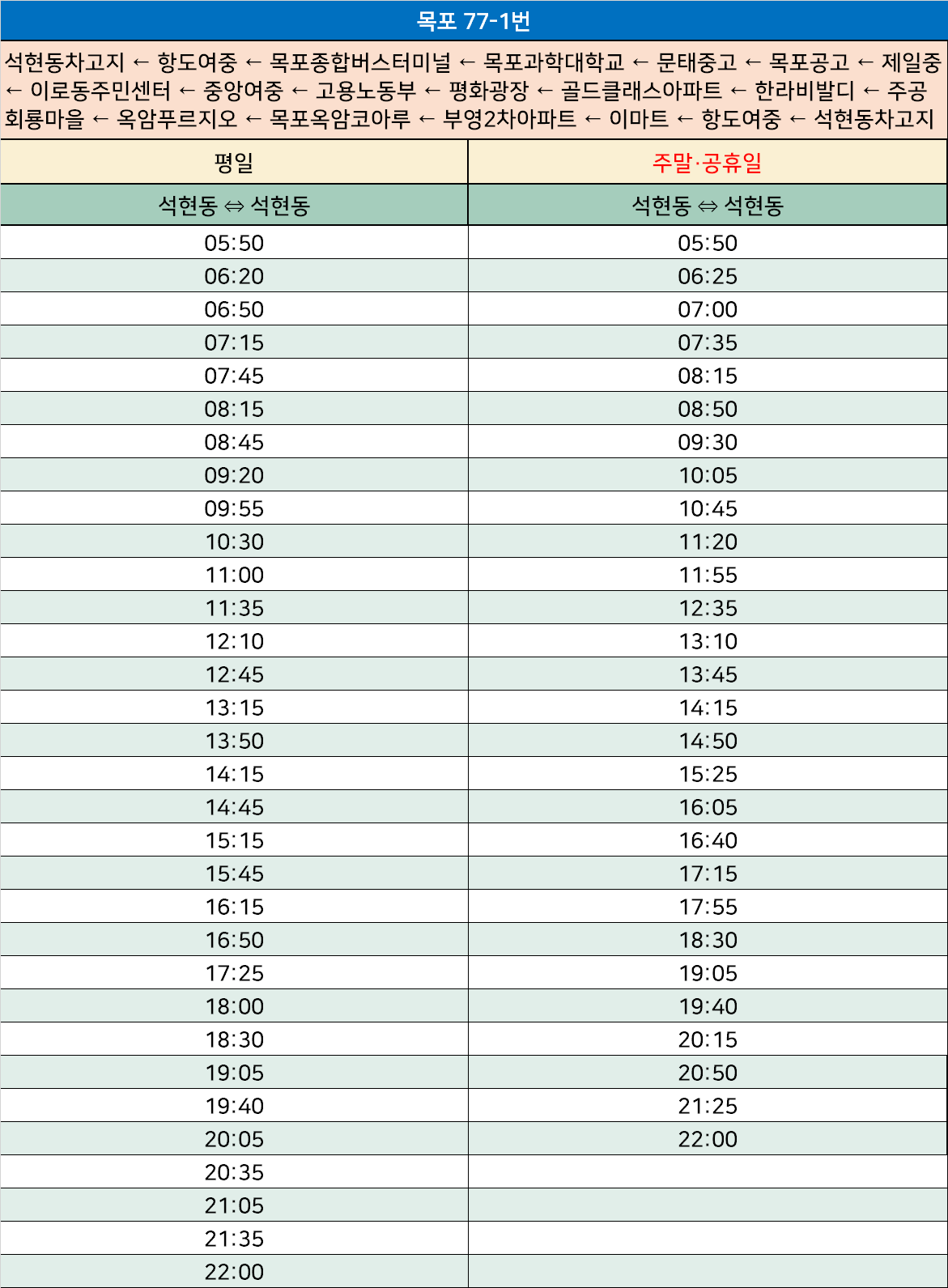 목포 77-1번: 석현동차고지 ← 항도여중 ← 목포종합버스터미널 ← 목포과학대학교 ← 문태중고 ← 목포공고 ← 제일중 ← 이로동주민센터 ← 중앙여중 ← 고용노동부 ← 평화광장 ← 골드클래스아파트 ← 한라비발디 ← 주공회룡마을 ← 옥암푸르지오 ← 목포옥암코아루 ← 부영2차아파트 ← 이마트 ← 항도여중 ← 석현동차고지