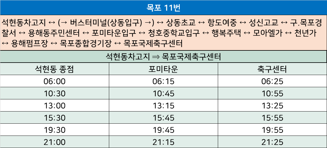 목포 11번: 석현동차고지 ↔ (→ 버스터미널(상동입구) →) ↔ 상동초교 ↔ 항도여중 ↔ 성신고교 ↔ 구.목포경찰서 ↔ 용해동주민센터 ↔ 포미타운입구 ↔ 청호중학교입구 ↔ 행복주택 ↔ 모아엘가 ↔ 천년가 ↔ 용해펌프장 ↔ 목포종합경기장 ↔ 목포국제축구센터