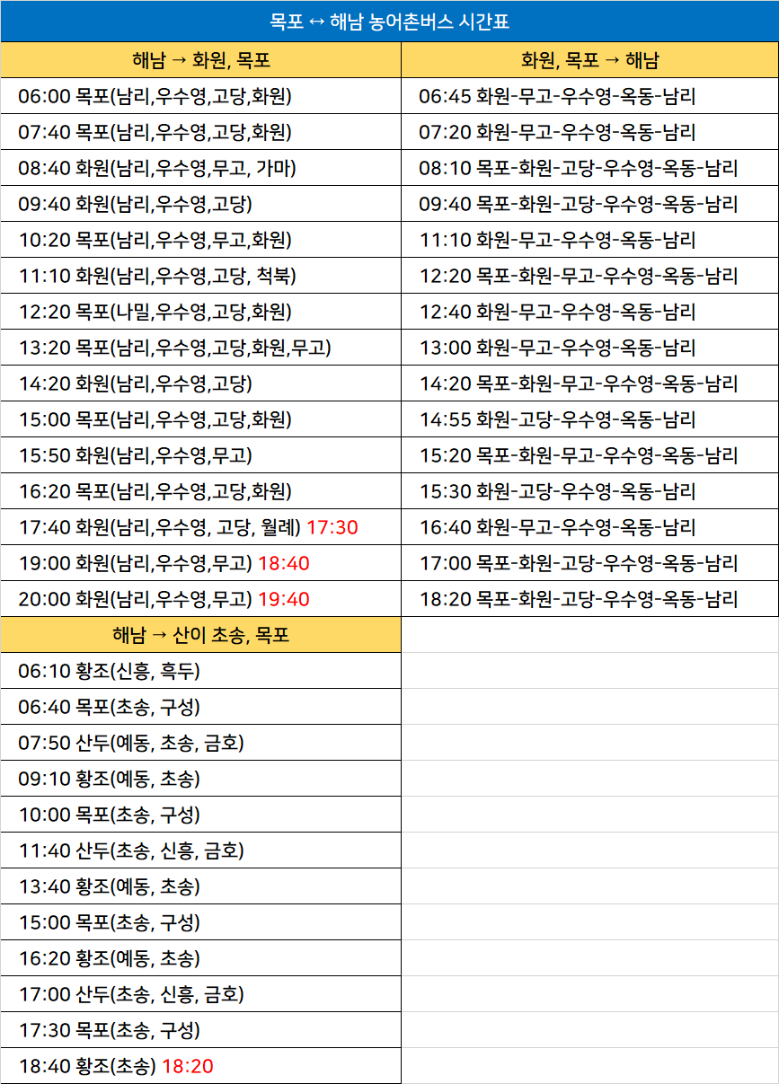 해남 ↔ 목포 농어촌버스 노선정보: 해남 → 산이 초송, 목포, 해남 → 화원, 목포