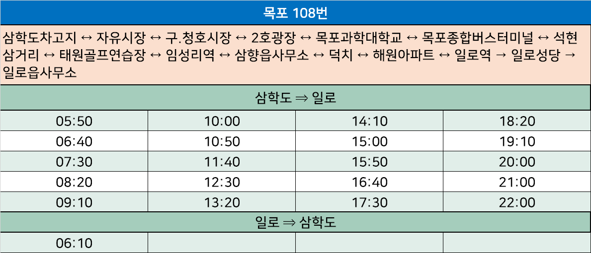 목포 108번: 삼학도차고지 ↔ 자유시장 ↔ 구.청호시장 ↔ 2호광장 ↔ 목포과학대학교 ↔ 목포종합버스터미널 ↔ 석현삼거리 ↔ 태원골프연습장 ↔ 임성리역 ↔ 삼향읍사무소 ↔ 덕치 ↔ 해원아파트 ↔ 일로역 → 일로성당 → 일로읍사무소