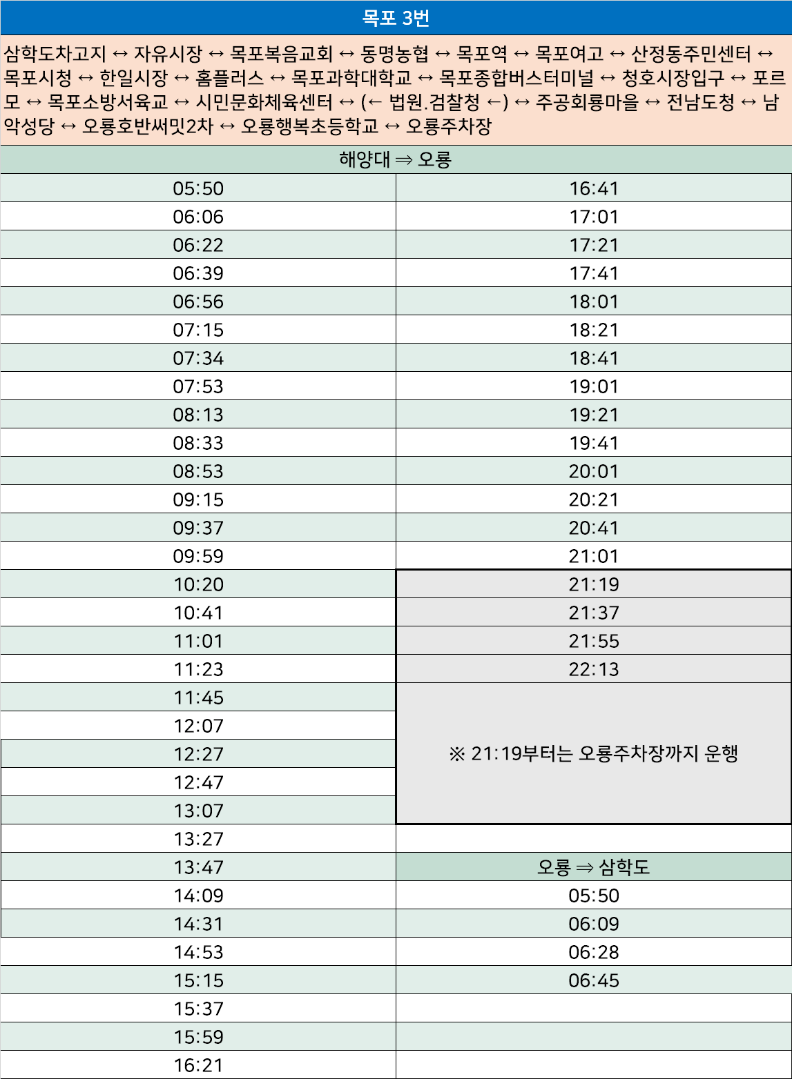 목포 3번: 삼학도차고지 ↔ 자유시장 ↔ 목포복음교회 ↔ 동명농협 ↔ 목포역 ↔ 목포여고 ↔ 산정동주민센터 ↔ 목포시청 ↔ 한일시장 ↔ 홈플러스 ↔ 목포과학대학교 ↔ 목포종합버스터미널 ↔ 청호시장입구 ↔ 포르모 ↔ 목포소방서육교 ↔ 시민문화체육센터 ↔ (← 법원.검찰청 ←) ↔ 주공회룡마을 ↔ 전남도청 ↔ 남악성당 ↔ 오룡호반써밋2차 ↔ 오룡행복초등학교 ↔ 오룡주차장