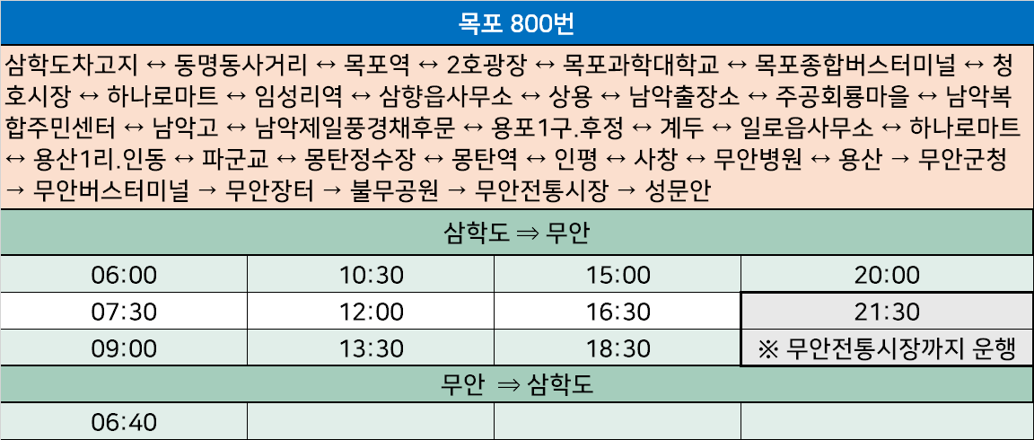 목포 800번: 삼학도차고지 ↔ 동명동사거리 ↔ 목포역 ↔ 2호광장 ↔ 목포과학대학교 ↔ 목포종합버스터미널 ↔ 청호시장 ↔ 하나로마트 ↔ 임성리역 ↔ 삼향읍사무소 ↔ 상용 ↔ 남악출장소 ↔ 주공회룡마을 ↔ 남악복합주민센터 ↔ 남악고 ↔ 남악제일풍경채후문 ↔ 용포1구.후정 ↔ 계두 ↔ 일로읍사무소 ↔ 하나로마트 ↔ 용산1리.인동 ↔ 파군교 ↔ 몽탄정수장 ↔ 몽탄역 ↔ 인평 ↔ 사창 ↔ 무안병원 ↔ 용산 → 무안군청 → 무안버스터미널 → 무안장터 → 불무공원 → 무안전통시장 → 성문안