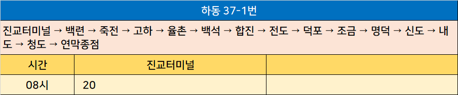 하동 37-1번: 진교터미널 → 백련 → 죽전 → 고하 → 율촌 → 백석 → 합진 → 전도 → 덕포 → 조금 → 명덕 → 신도 → 내도 → 청도 → 연막종점