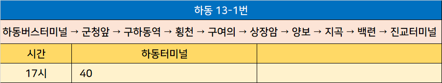 하동 13-1번: 하동버스터미널 → 군청앞 → 구하동역 → 횡천 → 구여의 → 상장암 → 양보 → 지곡 → 백련 → 진교터미널