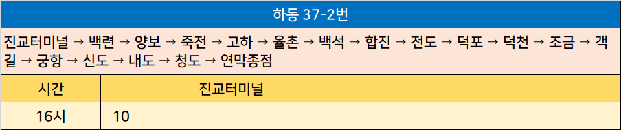 하동 37-2번: 진교터미널 → 백련 → 양보 → 죽전 → 고하 → 율촌 → 백석 → 합진 → 전도 → 덕포 → 덕천 → 조금 → 객길 → 궁항 → 신도 → 내도 → 청도 → 연막종점