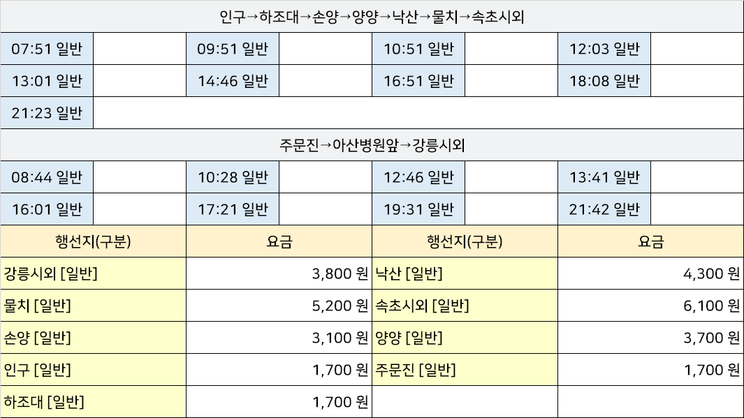남애시외고속버스터미널 남애정류장 남애정류소 → "인구→하조대→손양→양양→낙산→물치→속초시외,주문진→아산병원앞→강릉시외".
