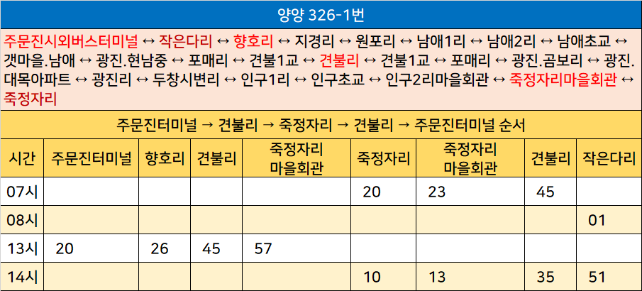 양양 326-1번: 주문진시외버스터미널 ↔ 작은다리 ↔ 향호리 ↔ 지경리 ↔ 원포리 ↔ 남애1리 ↔ 남애2리 ↔ 남애초교 ↔ 갯마을.남애 ↔ 광진.현남중 ↔ 포매리 ↔ 견불1교 ↔ 견불리 ↔ 견불1교 ↔ 포매리 ↔ 광진.곰보리 ↔ 광진.대목아파트 ↔ 광진리 ↔ 두창시변리 ↔ 인구1리 ↔ 인구초교 ↔ 인구2리마을회관 ↔ 죽정자리마을회관 ↔ 죽정자리
