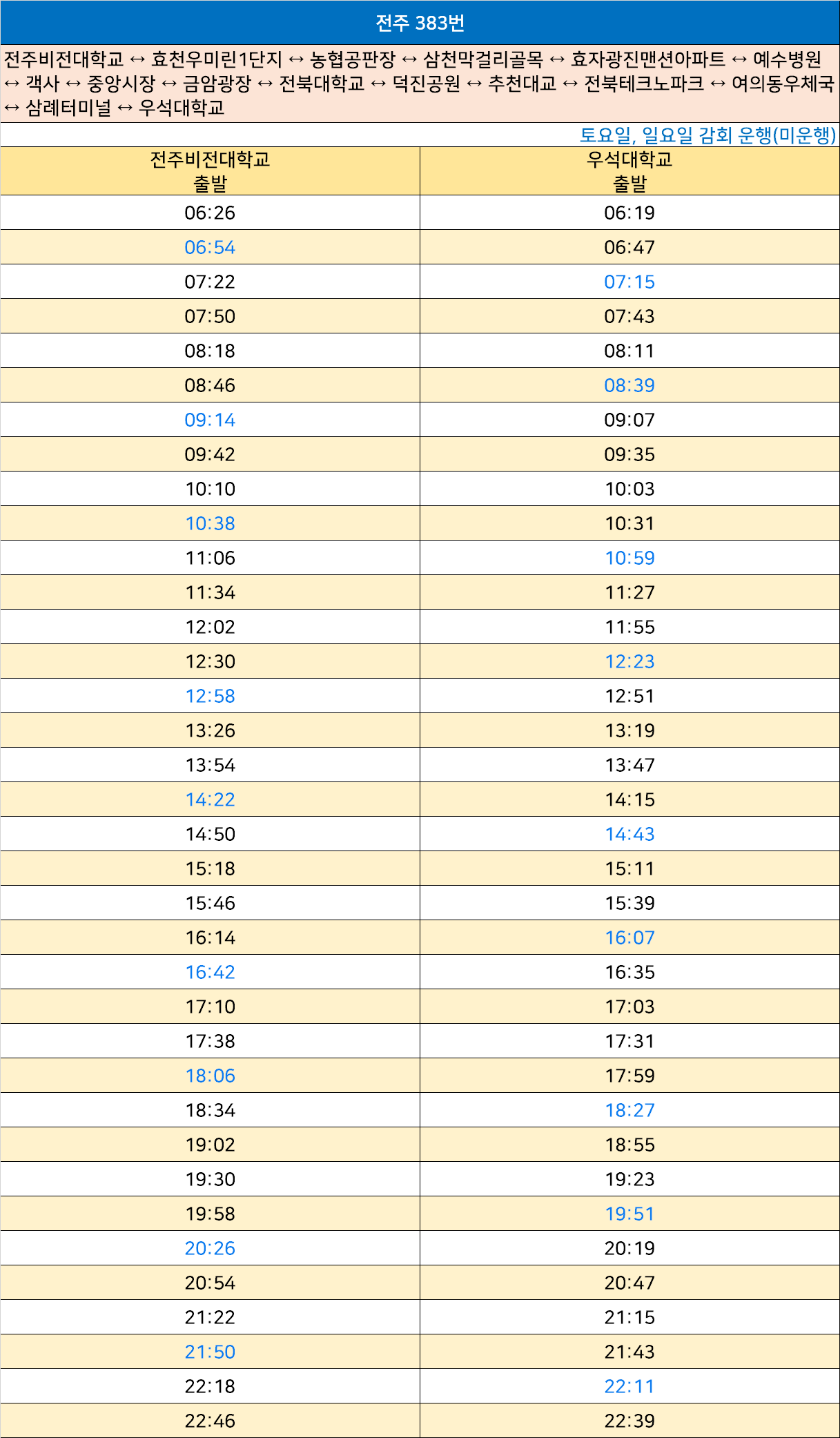 전주 383번: 전주비전대학교 ↔ 효천우미린1단지 ↔ 농협공판장 ↔ 삼천막걸리골목 ↔ 효자광진맨션아파트 ↔ 예수병원 ↔ 객사 ↔ 중앙시장 ↔ 금암광장 ↔ 전북대학교 ↔ 덕진공원 ↔ 추천대교 ↔ 전북테크노파크 ↔ 여의동우체국 ↔ 삼례터미널 ↔ 우석대학교
