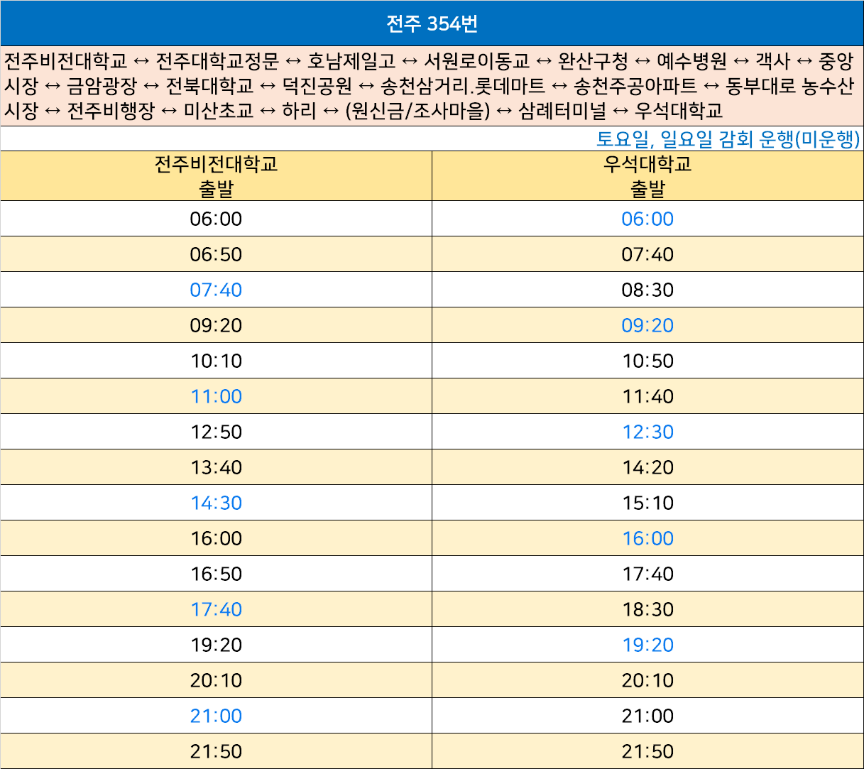 전주 354번: 전주비전대학교 ↔ 전주대학교정문 ↔ 호남제일고 ↔ 서원로이동교 ↔ 완산구청 ↔ 예수병원 ↔ 객사 ↔ 중앙시장 ↔ 금암광장 ↔ 전북대학교 ↔ 덕진공원 ↔ 송천삼거리.롯데마트 ↔ 송천주공아파트 ↔ 동부대로 농수산시장 ↔ 전주비행장 ↔ 미산초교 ↔ 하리 ↔ (원신금/조사마을) ↔ 삼례터미널 ↔ 우석대학교