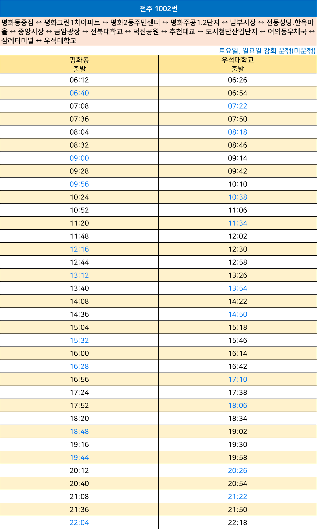 전주 1002번:평화동종점 ↔ 평화그린1차아파트 ↔ 평화2동주민센터 ↔ 평화주공1.2단지 ↔ 남부시장 ↔ 전동성당.한옥마을 ↔ 중앙시장 ↔ 금암광장 ↔ 전북대학교 ↔ 덕진공원 ↔ 추천대교 ↔ 도시첨단산업단지 ↔ 여의동우체국 ↔ 삼례터미널 ↔ 우석대학교