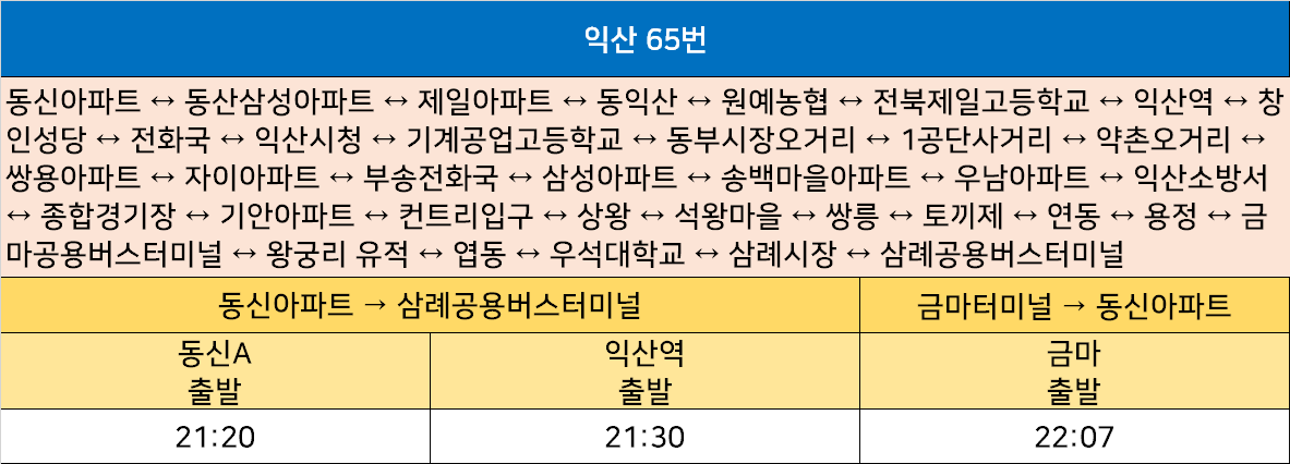 익산 65번: 동신아파트 ↔ 동산삼성아파트 ↔ 제일아파트 ↔ 동익산 ↔ 원예농협 ↔ 전북제일고등학교 ↔ 익산역 ↔ 창인성당 ↔ 전화국 ↔ 익산시청 ↔ 기계공업고등학교 ↔ 동부시장오거리 ↔ 1공단사거리 ↔ 약촌오거리 ↔ 쌍용아파트 ↔ 자이아파트 ↔ 부송전화국 ↔ 삼성아파트 ↔ 송백마을아파트 ↔ 우남아파트 ↔ 익산소방서 ↔ 종합경기장 ↔ 기안아파트 ↔ 컨트리입구 ↔ 상왕 ↔ 석왕마을 ↔ 쌍릉 ↔ 토끼제 ↔ 연동 ↔ 용정 ↔ 금마공용버스터미널 ↔ 왕궁리 유적 ↔ 엽동 ↔ 우석대학교 ↔ 삼례시장 ↔ 삼례공용버스터미널