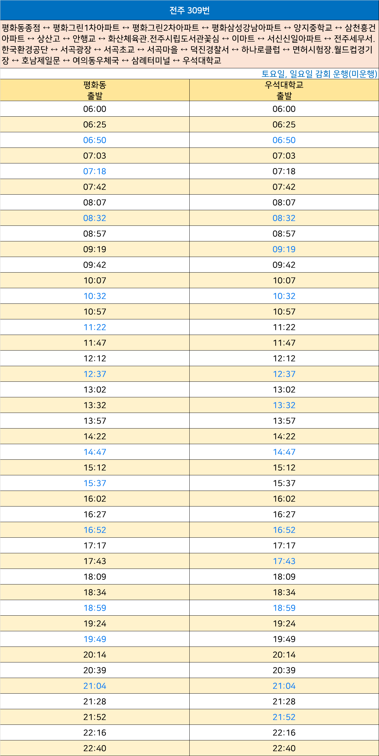 전주 309번: 평화동종점 ↔ 평화그린1차아파트 ↔ 평화그린2차아파트 ↔ 평화삼성강남아파트 ↔ 양지중학교 ↔ 삼천흥건아파트 ↔ 상산고 ↔ 안행교 ↔ 화산체육관.전주시립도서관꽃심 ↔ 이마트 ↔ 서신신일아파트 ↔ 전주세무서.한국환경공단 ↔ 서곡광장 ↔ 서곡초교 ↔ 서곡마을 ↔ 덕진경찰서 ↔ 하나로클럽 ↔ 면허시험장.월드컵경기장 ↔ 호남제일문 ↔ 여의동우체국 ↔ 삼례터미널 ↔ 우석대학교