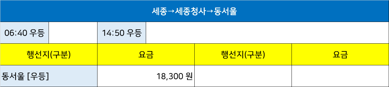 자운대시외고속버스정류소 자운대정류장 자운대터미널 → "세종→세종청사→동서울".