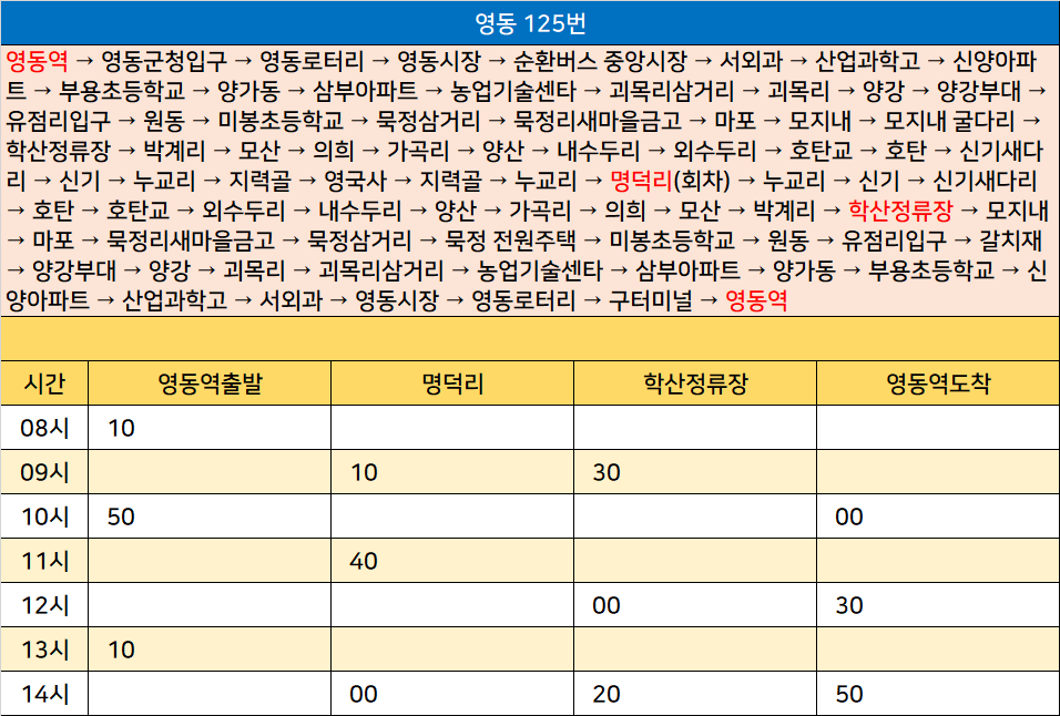 영동 125번: 영동역 → 영동군청입구 → 영동로터리 → 영동시장 → 순환버스 중앙시장 → 서외과 → 산업과학고 → 신양아파트 → 부용초등학교 → 양가동 → 삼부아파트 → 농업기술센타 → 괴목리삼거리 → 괴목리 → 양강 → 양강부대 → 유점리입구 → 원동 → 미봉초등학교 → 묵정삼거리 → 묵정리새마을금고 → 마포 → 모지내 → 모지내 굴다리 → 학산정류장 → 박계리 → 모산 → 의희 → 가곡리 → 양산 → 내수두리 → 외수두리 → 호탄교 → 호탄 → 신기새다리 → 신기 → 누교리 → 지력골 → 영국사 → 지력골 → 누교리 → 명덕리(회차) → 누교리 → 신기 → 신기새다리 → 호탄 → 호탄교 → 외수두리 → 내수두리 → 양산 → 가곡리 → 의희 → 모산 → 박계리 → 학산정류장 → 모지내 → 마포 → 묵정리새마을금고 → 묵정삼거리 → 묵정 전원주택 → 미봉초등학교 → 원동 → 유점리입구 → 갈치재 → 양강부대 → 양강 → 괴목리 → 괴목리삼거리 → 농업기술센타 → 삼부아파트 → 양가동 → 부용초등학교 → 신양아파트 → 산업과학고 → 서외과 → 영동시장 → 영동로터리 → 구터미널 → 영동역