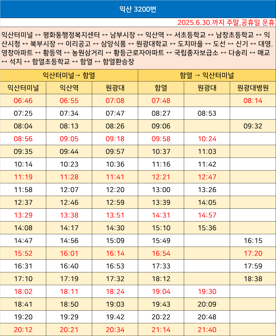 익산 3200번: 익산터미널 ↔ 평화동행정복지센터 ↔ 남부시장 ↔ 익산역 ↔ 서초등학교 ↔ 남창초등학교 ↔ 익산시청 ↔ 북부시장 ↔ 이리공고 ↔ 삼양식품 ↔ 원광대학교 ↔ 도치마을 ↔ 도선 ↔ 신기 ↔ 대영.영창아파트 ↔ 황등역 ↔ 농원삼거리 ↔ 황등근로자아파트 ↔ 국립종자보급소 ↔ 다송리 ↔ 매교 ↔ 석치 ↔ 함열초등학교 ↔ 함열 ↔ 함열환승장