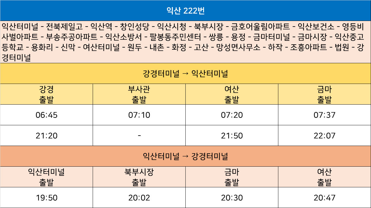 익산 222번: 익산터미널 ↔ 전북제일고 ↔ 익산역 ↔ 창인성당 ↔ 익산시청 ↔ 북부시장 ↔ 금호어울림아파트 ↔ 익산보건소 ↔ 영등비사벌아파트 ↔ 부송주공아파트 ↔ 익산소방서 ↔ 팔봉동주민센터 ↔ 쌍릉 ↔ 용정 ↔ 금마터미널 ↔ 금마시장 ↔ 익산중고등학교 ↔ 용화리 ↔ 신막 ↔ 여산터미널 ↔ 원두 ↔ 내촌 ↔ 화정 ↔ 고산 ↔ 망성면사무소 ↔ 하작 ↔ 조흥아파트 ↔ 법원 ↔ 강경터미널