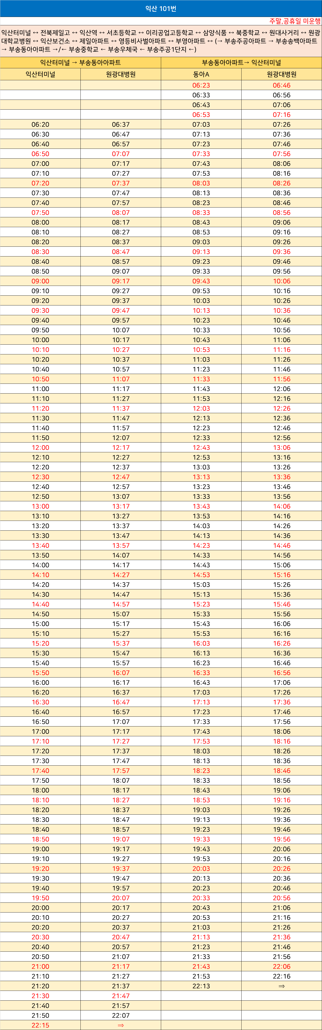 익산 101번: 익산터미널 ↔ 전북제일고 ↔ 익산역 ↔ 서초등학교 ↔ 이리공업고등학교 ↔ 삼양식품 ↔ 북중학교 ↔ 원대사거리 ↔ 원광대학교병원 ↔ 익산보건소 ↔ 제일아파트 ↔ 영등비사벌아파트 ↔ 부영아파트 ↔ (→ 부송주공아파트 → 부송송백아파트 → 부송동아아파트 →/← 부송중학교 ← 부송우체국 ← 부송주공1단지 ←)